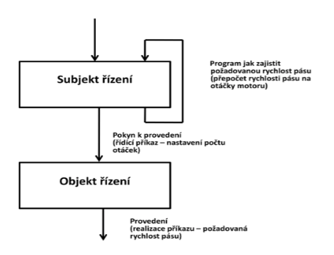 Řídící jednotka linky určuje rychlost pásu. Podle požadované rychlosti dává pokyn elektromotoru (objekt řízení), kolik má mít otáček.